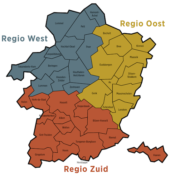 Regio Oost (geel): As, Bocholt, Bree, Dilsen-Stokkem, Genk, Kinrooi, Lanaken, Maaseik, Maasmechelen, Oudsbergen, Zutendaal